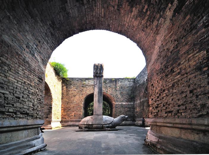 前半部分主要包括大金门、神道、神功圣德碑,然后从石像处开始拐弯,绕过了梅花山。神道往南是下马坊,坊额上刻有“诸司官员下马”六个大字。另外,还有嘉靖、崇祯时期为保护孝陵而建的碑。其实整个孝陵的外围还有一座大城把它包围起来,这座城不是四四方方的,而是弯弯曲曲的。城的正门是大金门,最初上面有金色琉璃瓦顶子,只可惜已被损毁,现今只剩下三个门券洞。