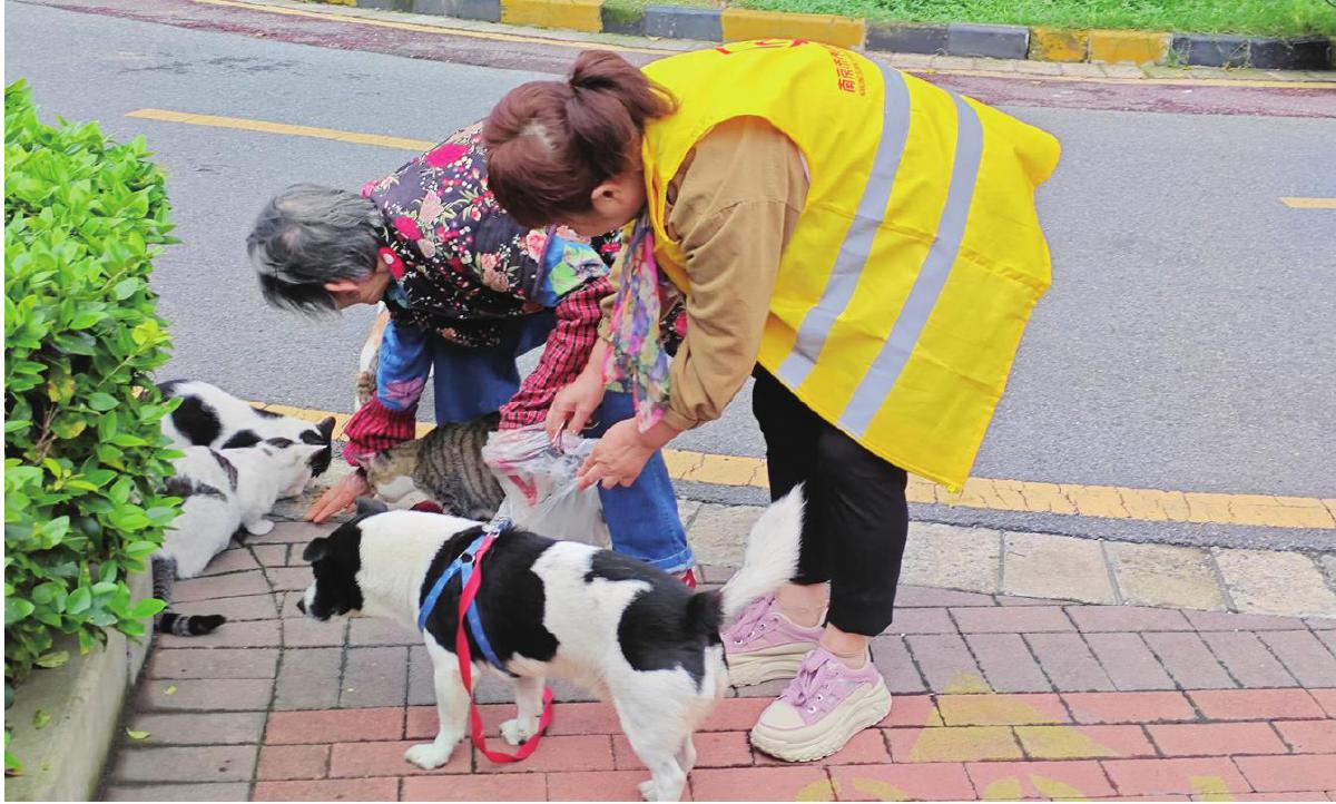 图为志愿者协助老人给小狗喂食。 受访者供图