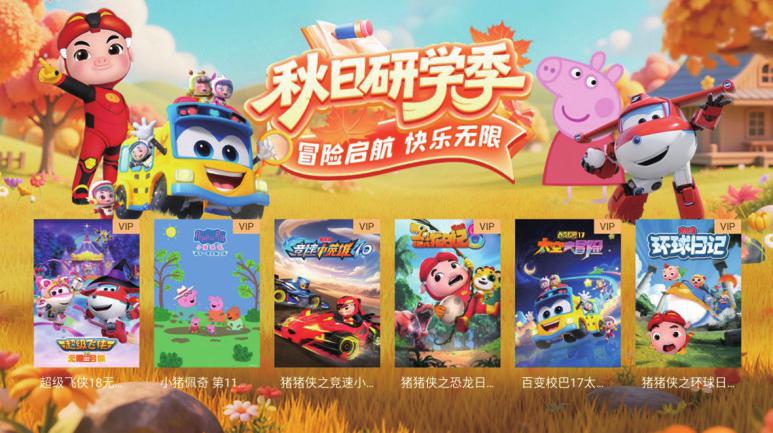 《超级飞侠18无限合体》《小猪佩奇 第11季》《猪猪侠之竞速小英雄10》《猪猪侠之恐龙日记第八季》《百变校巴17太空大冒险》《猪猪侠之环球日记》等精彩内容邀您一起开启秋日研学季,踏上冒险之旅,带来快乐新体验。