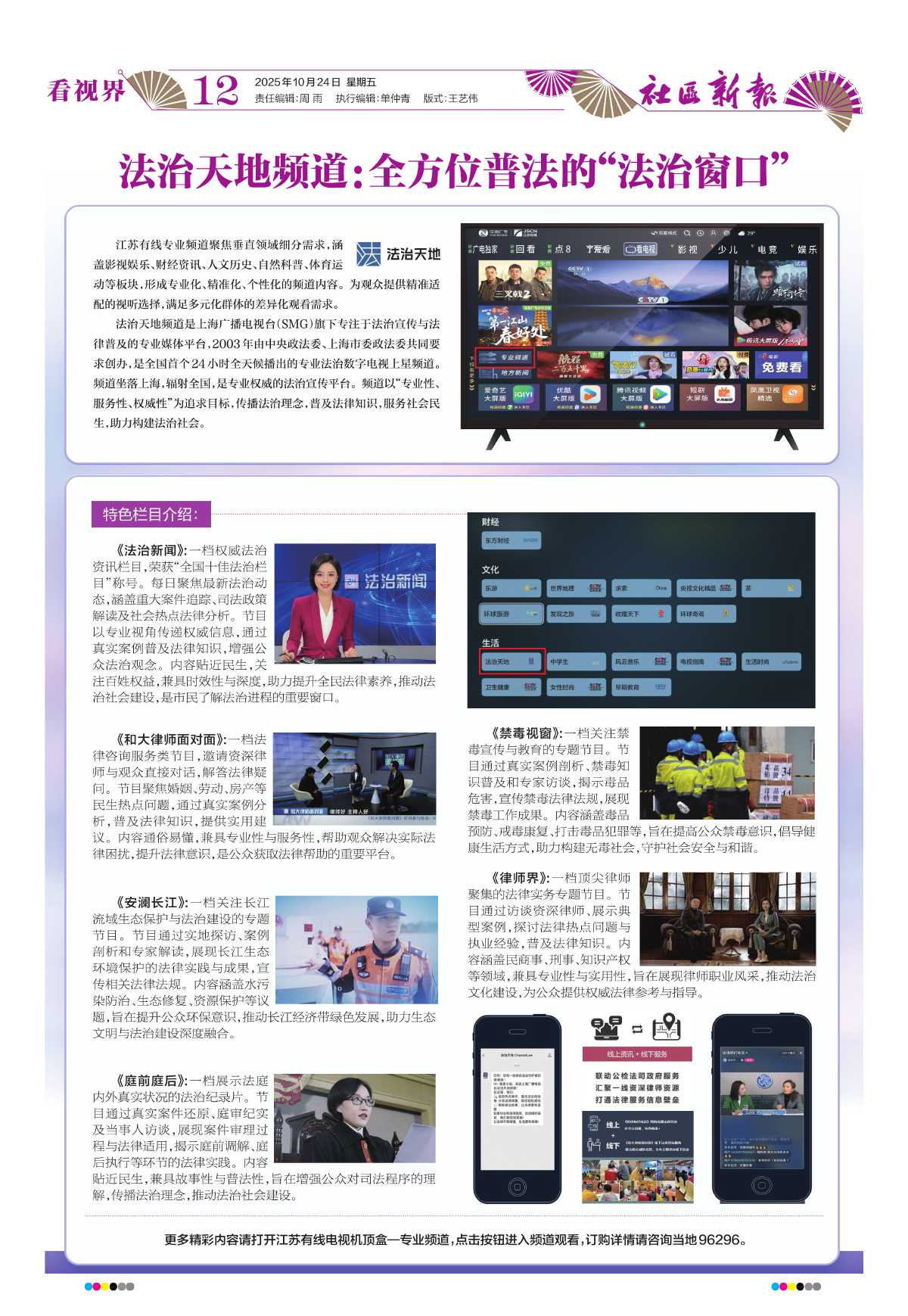 《法治新闻》:一档权威法治资讯栏目,荣获“全国十佳法治栏目”称号。每日聚焦最新法治动态,涵盖重大案件追踪、司法政策解读及社会热点法律分析。节目以专业视角传递权威信息,通过真实案例普及法律知识,增强公众法治观念。内容贴近民生,关注百姓权益,兼具时效性与深度,助力提升全民法律素养,推动法治社会建设,是市民了解法治进程的重要窗口。