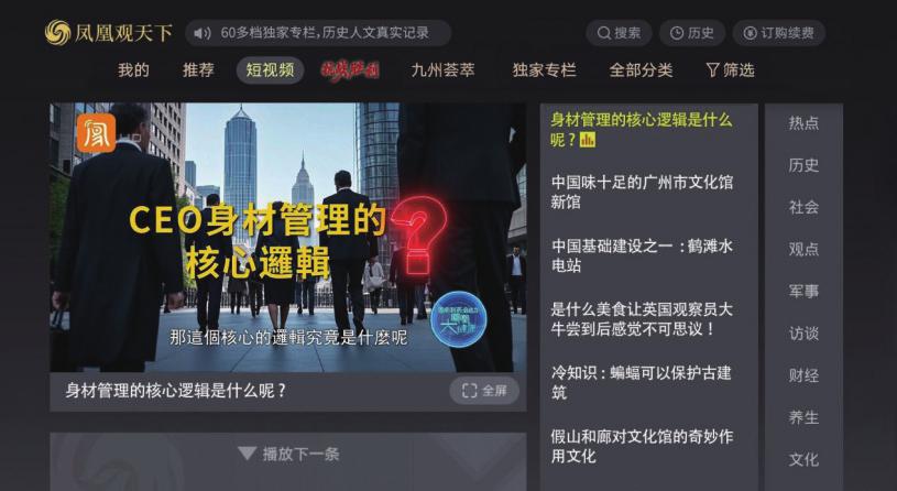 凤凰观天下是由江苏有线全新引入的精品视频点播产品,该专区整合了凤凰卫视优质版权内容,集资讯、评论、历史军事、访谈、社会专题、财经和纪录片等类型节目为一体,全方位提供综合新闻资讯、深度报道、观点评论等视频点播服务,满足用户多元化与个性化的视听需求。