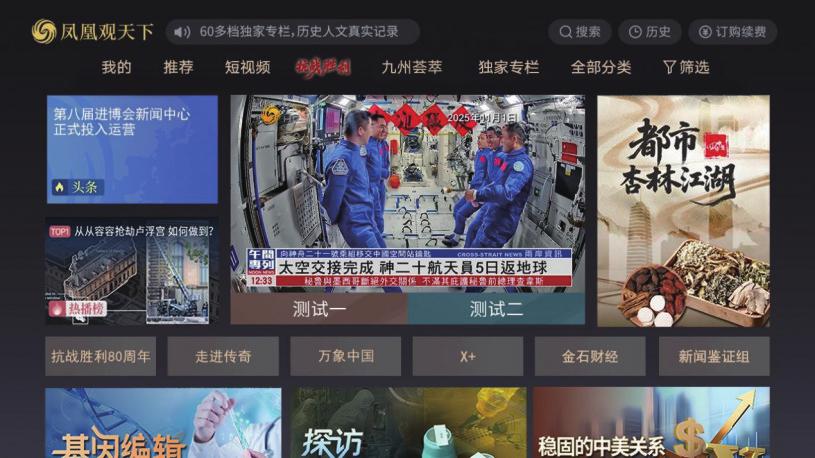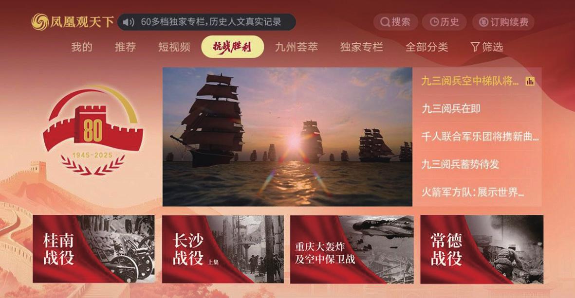 主题编播采用长短结合的模式,从《凤凰大视野》和《大抗战》栏目中,精心剪辑1—3分钟的精彩内容,上线短视频“抗战”栏目。这些短视频内容聚焦抗战中的关键瞬间、英雄故事、历史背景等,以精炼、生动的形式呈现给观众,满足观众在碎片化时间内获取优质内容的需求。该主题内容整合凤凰卫视独家版权纪录片等抗战主题节目超过200期,累计时长超过100小时。同时,同步凤凰卫视推出《焦土之上》等纪念中国人民抗日战争暨世界反法西斯战争胜利80周年特别编播纪录片等全新内容。