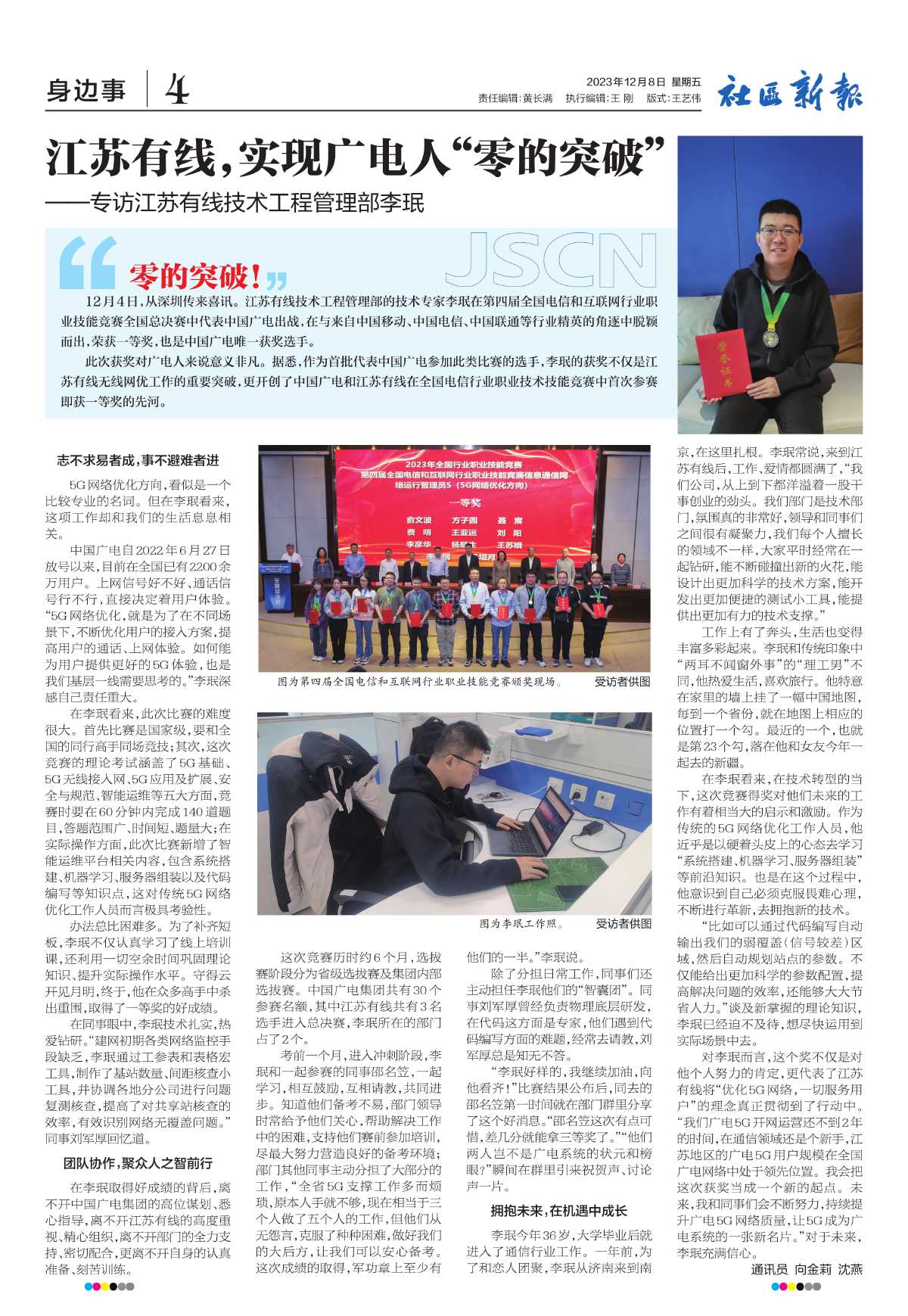 对李珉而言,这个奖不仅是对他个人努力的肯定,更代表了江苏有线将“优化5G网络,一切服务用户”的理念真正贯彻到了行动中。“我们广电5G开网运营还不到2年的时间,在通信领域还是个新手,江苏地区的广电5G用户规模在全国广电网络中处于领先位置。我会把这次获奖当成一个新的起点。未来,我和同事们会不断努力,持续提升广电5G网络质量,让5G成为广电系统的一张新名片。”对于未来,李珉充满信心。